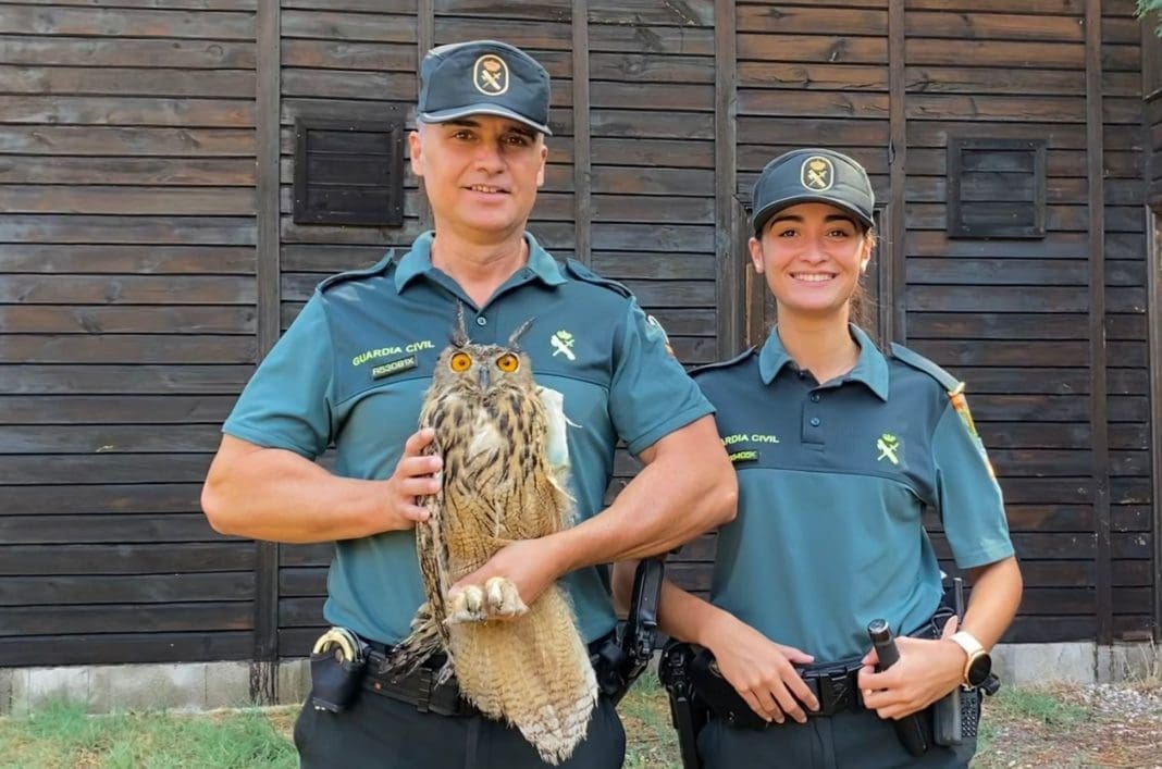 La Guardia Civil de Valencia y los agentes de la Guardería rural rescatan a un búho real desorientado y herido en el municipio valenciano de Chiva, atendiendo la llamada de alerta de un vecino de la localidad.