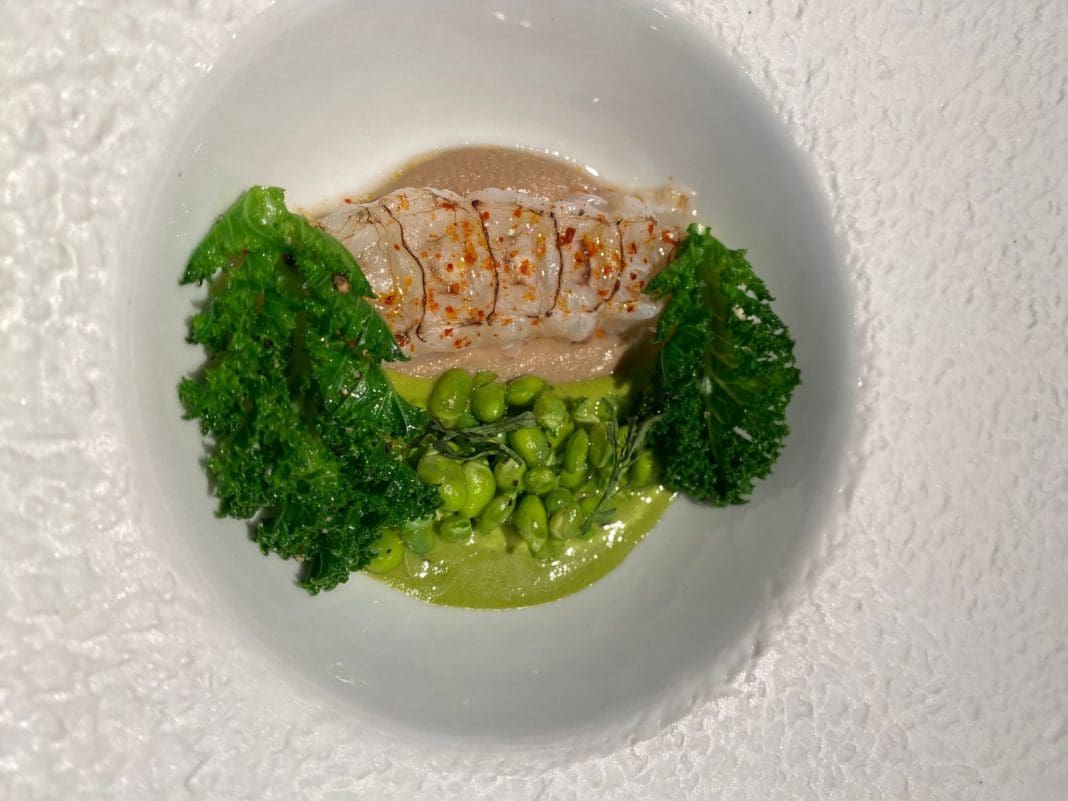 Los guisantes lágrima, crema verde con aromáticos y galera representa la oferta del restaurante Simposio, que apuesta por una cocina honesta y respetuosa con el medio ambiente. El plato se elabora con un aprovechamiento total de los ingredientes, sin ningún tipo de desperdicio. Las vainas de los guisantes se utilizan para elaborar la crema verde, mientras que la galera se aprovecha tanto la carne como las cabezas y las pieles para hacer un bisqué tradicional.