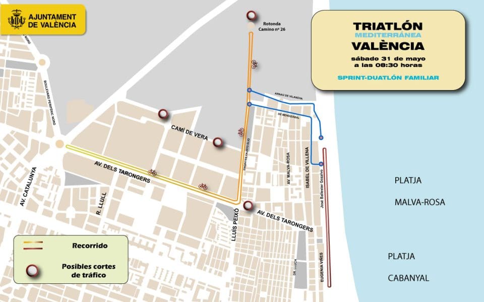 El recorrido se hará tres veces y, en la última vuelta, se continuará por Arnau de Vilanova, Isabel de Villena y José Ballester Gozalvo para realizar la transición a la carrera a pie.