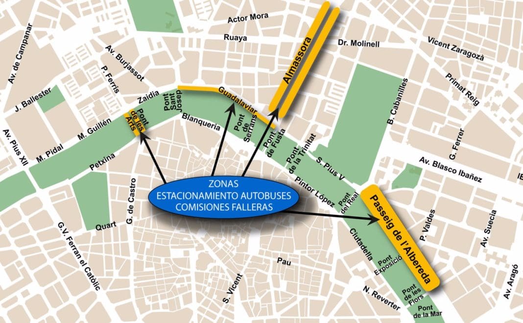 Posteriormente, estacionarán en el paseo de la Alameda. Los días de la Ofrenda, los autobuses de las comisiones estacionarán en el paseo de la Alameda –entre el puente del Real y el de las Flores–, ambos sentidos de la calle Almassora y del puente de las Artes, y en un carril de la marginal izquierda desde el puente de San José hasta el de madera.