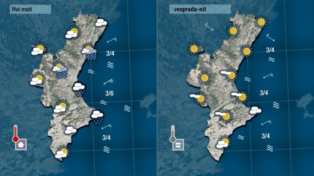 El gregal se reforzará con el paso de las horas dejando áreas de marejada junto a la costa y de fuerte marejada mar adentro. Las nubes serán más abundantes y compactas en la costa dónde durante la mañana hay que esperar precipitaciones que de nuevo en el sur de València y en el norte de Alicante pueden ser moderadas. Por la tarde el cielo se mantendrá cubierto pero solo hay que esperar lloviznas débiles.