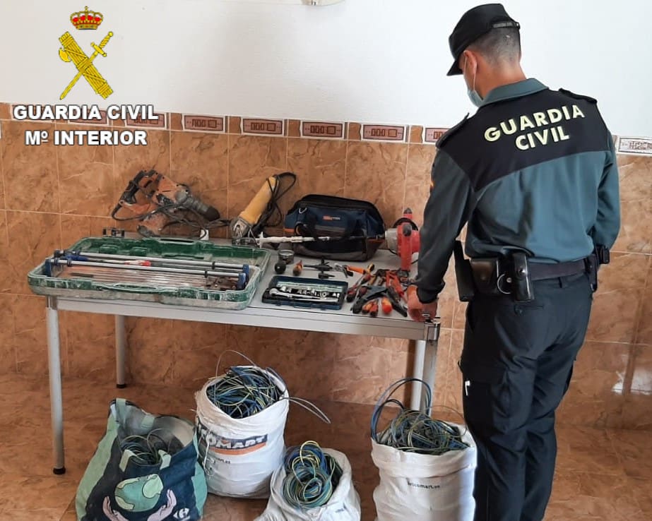 Al seguirlo, llegaron hasta 3 habitaciones más donde localizaron 4 sacos con más de 250 kilogramos de cable de cobre, una máquina corta–azulejos, una radial, un martillo percutor profesional, un amasador eléctrico de obra y distintas herramienta de mano. Debido a la dudosa procedencia legal de lo hallado, es intervenido por la Guardia Civil de Silla.