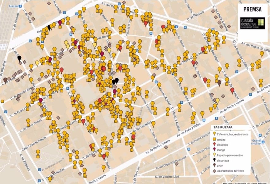 Desde el inicio del proceso judicial por Russafa Descansa en 2017, «este barrio es más ZAS y más ZAS a pesar de la propagada limitación a la apertura de nuevos locales hosteleros de 2014, pues han continuado abriendo nuevos establecimientos y ampliándose terrazas abusivamente».