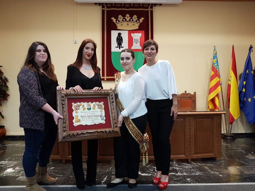 L’alcaldessa de Benifaió Marta Ortiz i la regidora de festes Júlia Manuel van fer lliurament a Sabrina del pergamí que l’acredita com a nova representant de les festes patronals que tindran lloc durant el mes d’agost en honor a Santa Bàrbara.