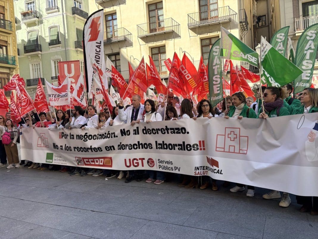 Así, tras una pancarta unitaria ‘Por la negociación. No al decretazo. No a los recortes en derechos laborales’ y se han concentrado al grito de ‘Mazón si sigues con Marciano se te irá de la mano’; ‘No a la dictadura de la Sanidad’; ‘Marciano, escucha, la Sanidad está en lucha’; o ‘Las promesas de Mazón mentiras a montón’ pare reclamar que se negocie un nuevo decreto.