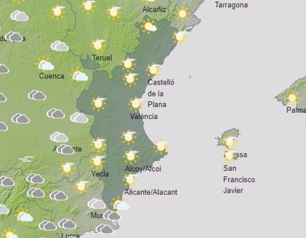 Además, se esperan heladas débiles en puntos del interior al final de la jornada, al tiempo que se registrarán intervalos nubosos y precipitaciones por la tarde en el tercio sur, sin descartar de forma ocasional en puntos del interior de Valencia.