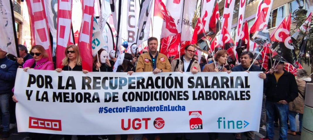 Durante las manifestaciones de hoy, convocadas por UGT, CCOO y FINE, se ha destacado que las plantillas del sector financiero “Estamos en Lucha para decir, alto y claro, que un sector que ha batido todos sus récords de beneficios, que aumenta dividendos y remuneraciones de su alta dirección, no puede seguir negando incrementos salariales justos y un clima laboral sano a sus plantillas.”
