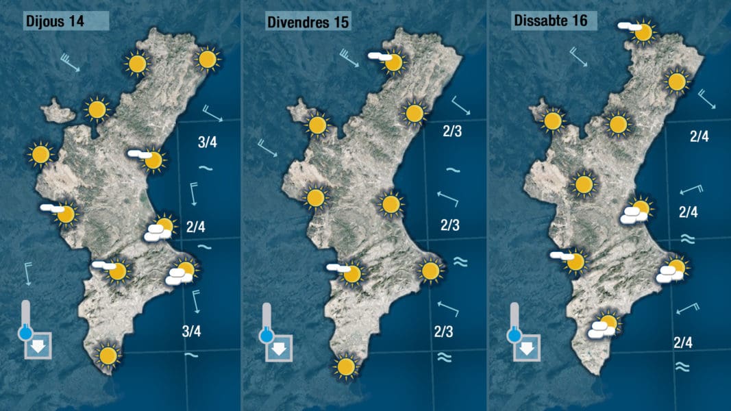 La segunda parte de la semana será más fresca pero con pocas novedades más porque el anticiclón acabará situándose en el centro de Europa y habrá que seguir su comportamiento ya que nos enviará viento de gregal a la mitad sur de la Comunitat, dejando el mar alterado a partir de viernes y aportará nubes a la costa pero a día de hoy los modelos no ‘ven’ lluvia.