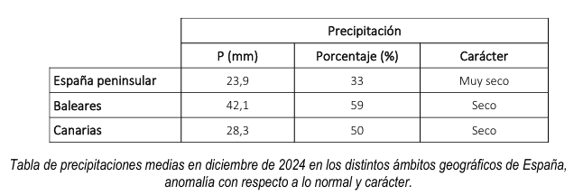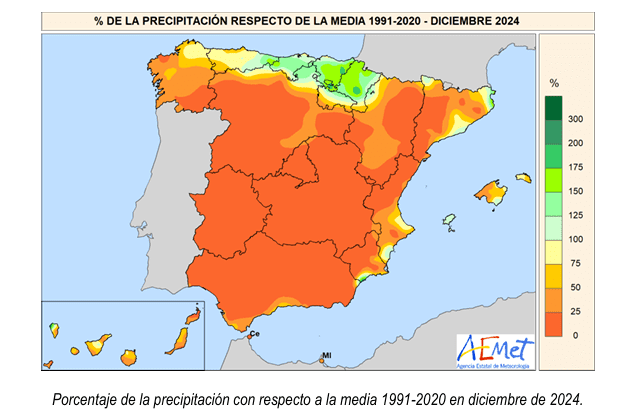 Diciembre fue entre seco y muy seco en casi todo el territorio peninsular y Baleares, excepto en la cornisa cantábrica, donde el mes fue entre normal y húmedo, al igual que en puntos más aislados del área mediterránea. En el archipiélago canario fue seco en conjunto, aunque en las islas occidentales hubo zonas con un carácter húmedo.