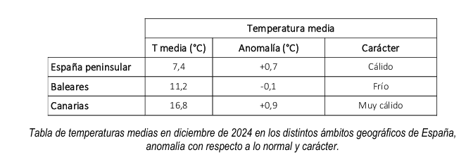 Diciembre resultó en conjunto cálido, con una temperatura media sobre la España peninsular de 7.4 °C, valor que queda 0.7 °C por encima de la media de este mes (periodo de referencia: 1991-2020). Fue el decimosexto mes de diciembre más cálido desde el comienzo de la serie en 1961, y el octavo más cálido del siglo XXI.