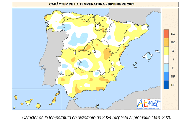 La Agencia Estatal de Meteorología (AEMET), dependiente del Ministerio para la Transición Ecológica y el Reto Demográfico (MITECO), ha hecho público el avance climático de diciembre de 2024. Fue un mes muy seco y de carácter cálido en el conjunto de la España peninsular, como consecuencia del predominio de las altas presiones durante el período.