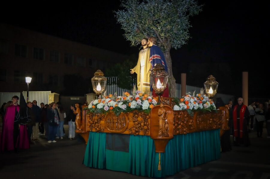 La jornada se ha prolongado hasta la medianoche con dos actos de especial relevancia. Por un lado, se ha celebrado el traslado de oración y penitencia del paso de la Oración del Huerto, desde la calle Toledo hasta la Casa Museo de la Semana Santa. Al mismo tiempo, ha tenido lugar el traslado procesional del paso del Prendimiento de Jesús desde la parroquia de Monte-Sión, precedido por el rezo del Vía Crucis y acompañado por la Schola Gregoriana Laetentur, cuyos motetes han reforzado la solemnidad del cierre de la jornada.