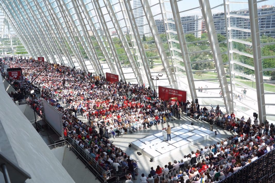Con casi una hora de retraso y sin un rastro de lluvia, pero sí con algún golpe de calor, los socialistas han comenzado su mitin central en València entre aplausos y gritos de ‘presidente, presidente’. Con ambiente de victoria y celebración y música para amenizar la jornada, cerca de 6.000 personas se han congregado en el Museo de las Ciencias para respaldar al presidente del Gobierno y secretario del PSOE, Pedro Sánchez; el president de la Generalitat y candidato a la reelección, Ximo Puig; y la candidata socialista a la Alcaldía, Sandra Gómez.