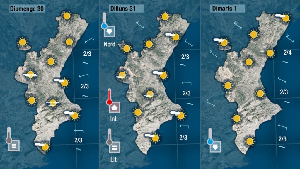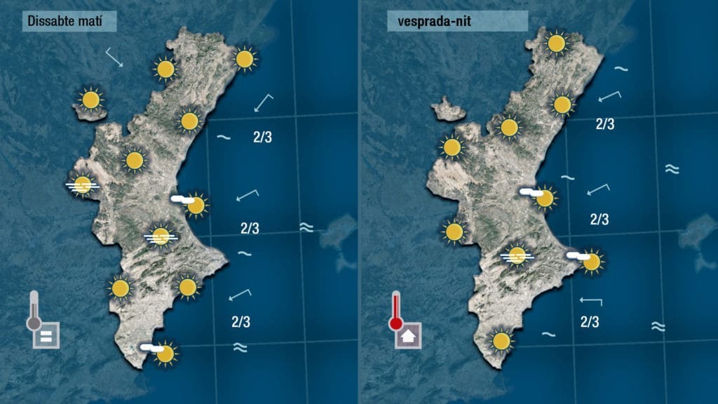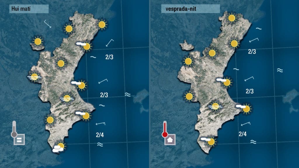 Hoy veremos pocas nubes. A primera hora del día la incidencia del vientos de gregal puede llevar nubes bajas a la costa y hacer que aumente la humedad y que las nieblas se depositen en las zonas hondas y en las llanuras, pero a mediodía lucirá el sol y esto favorecerá un ascenso térmico que llevará las temperaturas a los 15, 16 o 17 grados a la mayor parte de observatorios tanto de la costa como del centro e interior de la Comunitat.