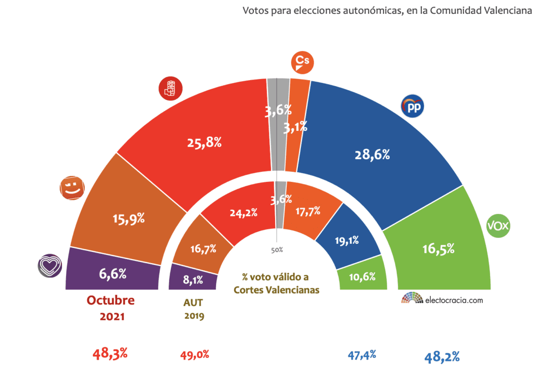El Partido Popular ganaría unas supuestas elecciones autonómicas en la Comunitat Valenciana si se realizarán ahora mismo. Según los datos presentados por la empresa demoscópica Electocracia.com, el bloque de la derecha (PP y Vox) obtendría un 48,2% de voto mientras que la parte de la izquierda (PSOE, Compromís y Podem) sacarían un 48,3%.