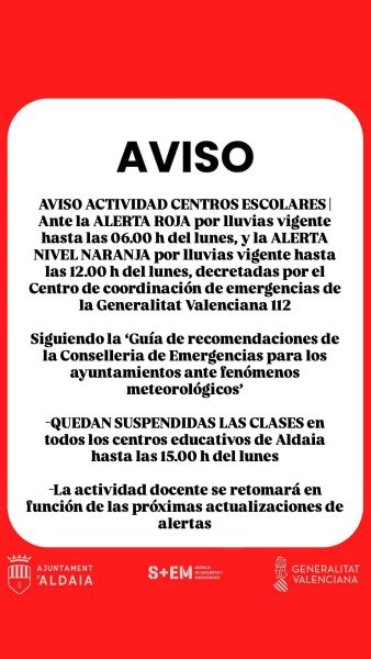 Paiporta, Catarroja, Benetússer y Aldaia, así como numerosas pedanías de València, entre las localidades que han anunciado la pausa lectiva.