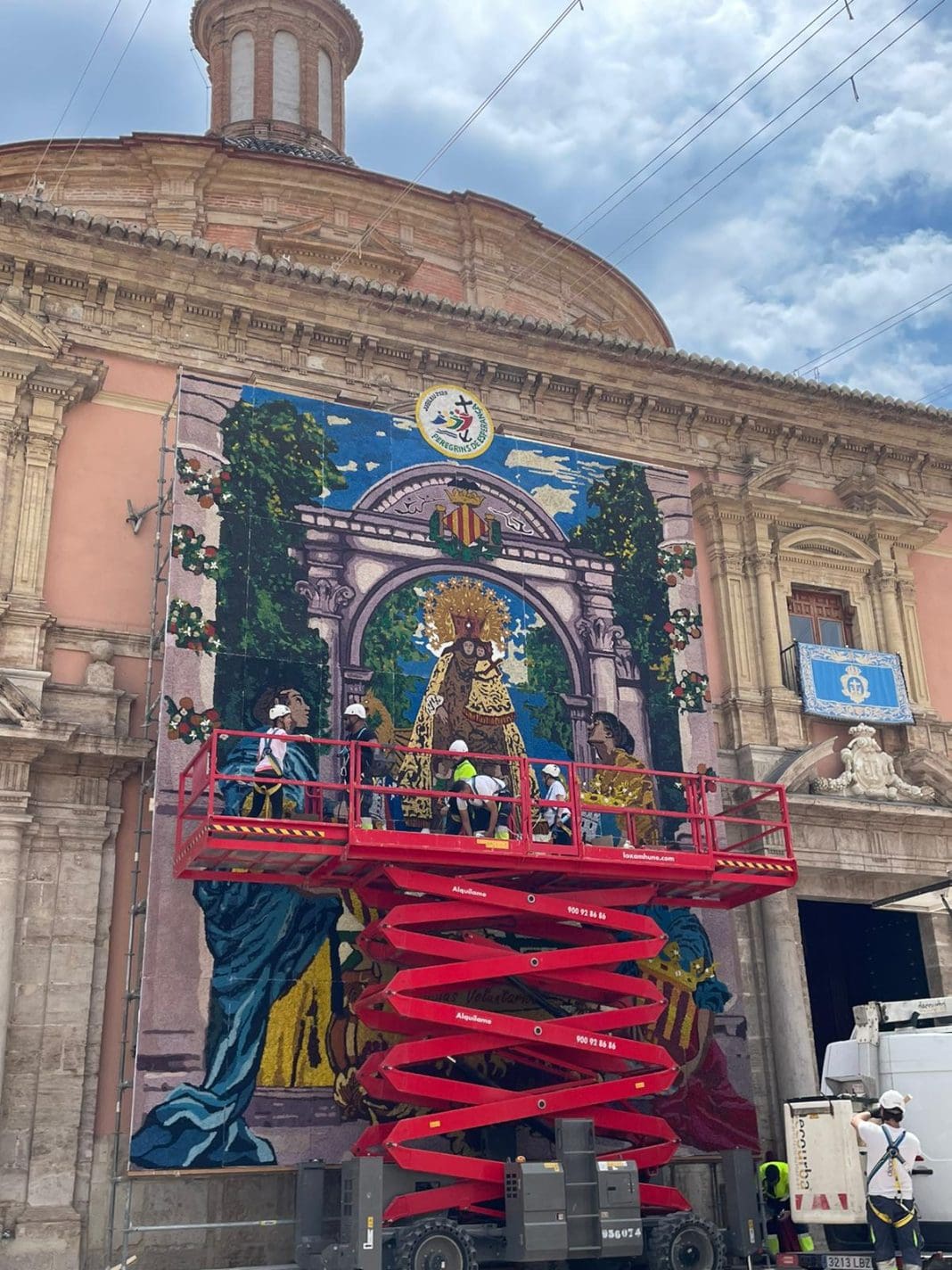 En plena cuenta atrás para la celebración de la festividad de la Virgen de los Desamparados, la ciudad de València se engalana. Este jueves 8 de mayo, el ya tradicional tapiz floral en honor  la Patrona quedaba instalado delante de la fachada de la Basílica de los Desamparados.