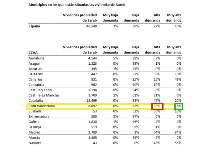 Unos datos que en la Comunitat Valenciana reflejan bastante fielmente la tendencia que parece repetirse a nivel nacional, donde dos tercios de las viviendas propiedad de Sareb se encuentran en municipios de baja o muy baja demanda de alquiler, según este estudio.