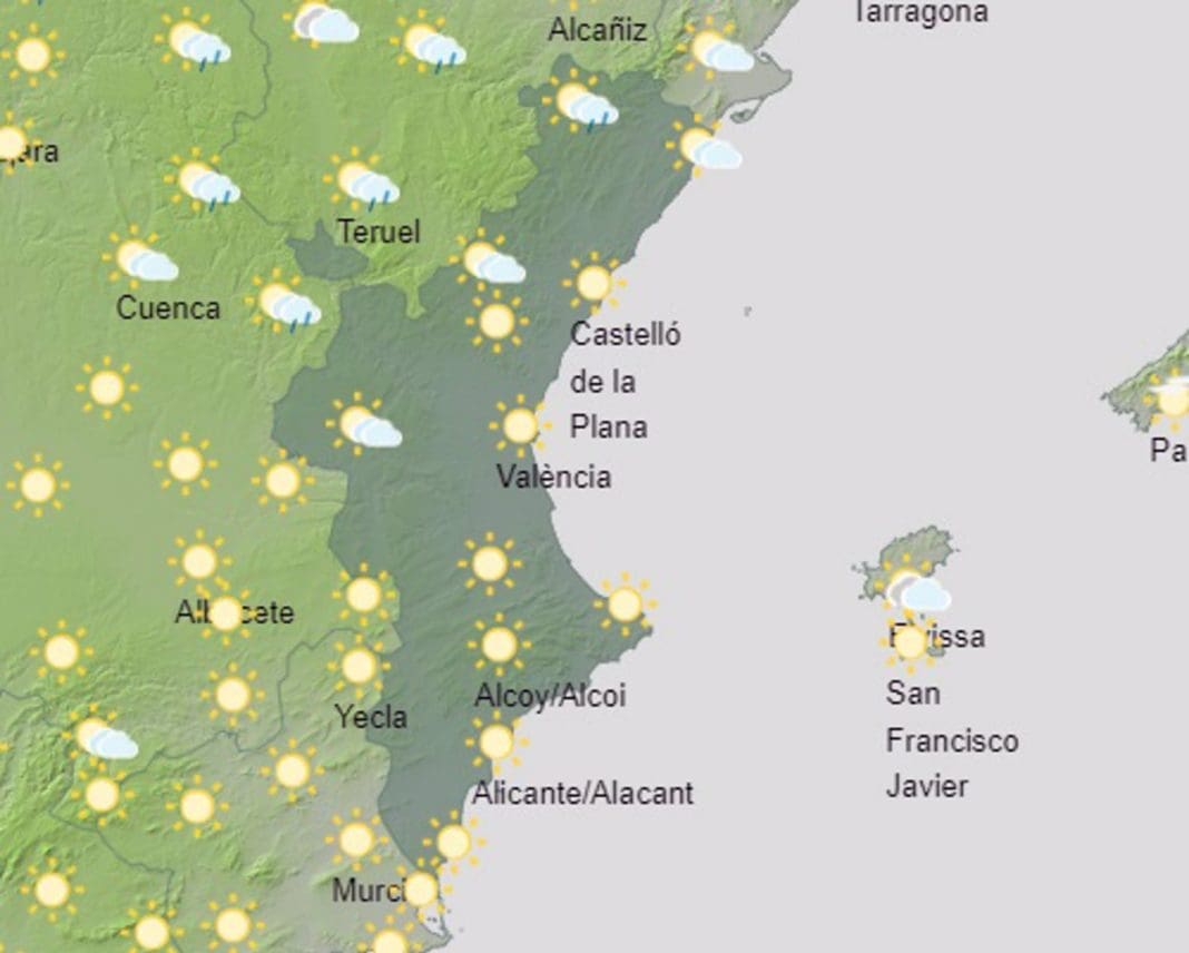 Finalmente, en Alicante, se esperan máximas de 35º en Orihuela, 34º en Alcoi, 32º en Elche y Dénia, y 30º en Alicante. Las mínimas serán de 19º en Alcoi, Elche y Orihuela, y 21º en Dénia y Alicante.