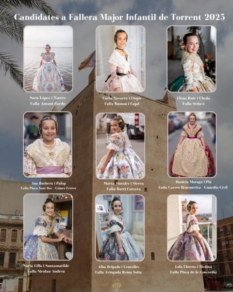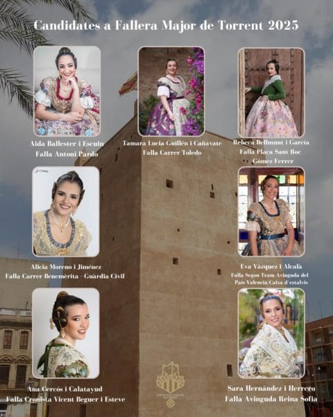 Las candidatas a Fallera Mayor de Torrent son:  Aida Ballester Escuin, de la Falla Antoni Pardo; Tamara Lucia Guillén Cañavate, de la Falla Carrer Toledo; Rebeca Bellmunt Garcia, de la Falla Plaça Sant Roc – Gómez Ferrer; Alicia Moreno i Jiménez, de la Falla Carrer Benemèrita – Guàrdia Civil; Eva Vázquez Alcalá, de la Falla Segon Tram Avinguda; Ana Cercós Calatayud, de la Falla Cronista Vicent Beguer Esteve y Sara Hernández Herrero, de la Falla Avinguda Reina Sofia.
