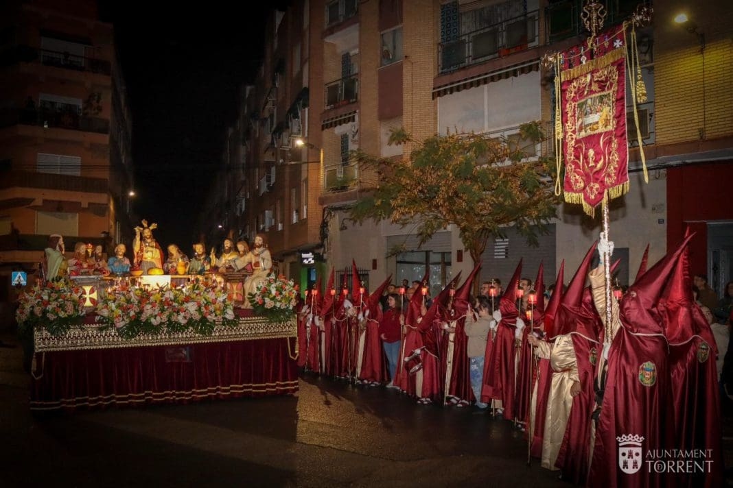 Acompañados únicamente por la Hermandad de la Crucifixión del Señor, la Santa Cena contó con la Banda de tambores y cornetas Ntra. Sra. del Redentor. Un traslado procesional que como acostumbra, discurrió por las calles del Poble Nou y en el que participaron tanto la Alcaldesa, Amparo Folgado, como miembros del equipo de gobierno y de la corporación municipal, así como Reinas del Encuentro de diferentes años.