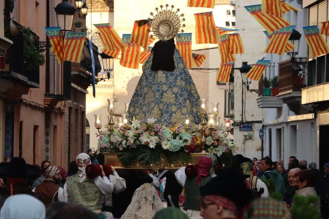 Los falleros de la comisión organizadora llevaron su imagen de la Virgen abriendo el desfile por las principales desde su demarcación, recorriendo la calle Gómez Ferrer, Sagra, Plaza Mayor y hasta la puerta de la Iglesia. Durante el trayecto hacia la Parroquia de la Asunción de Nuestra Señora, los falleros recitaron poesías en honor a la patrona de Torrent, mostrando su devoción y fervor en una de las citas más emotivas de la programación fallera.