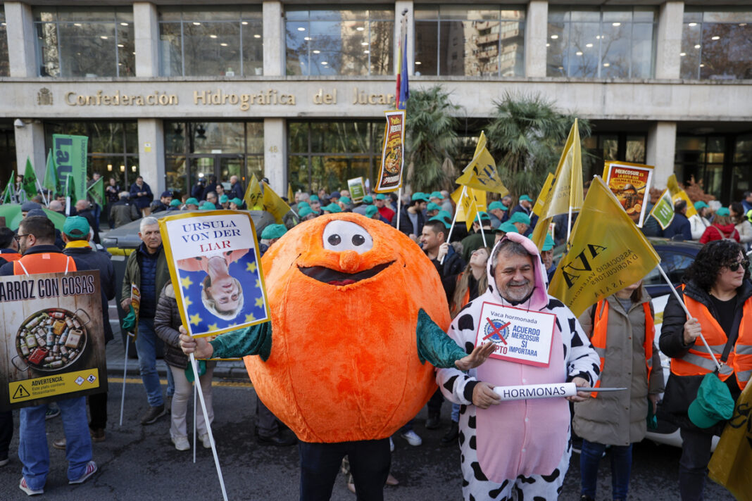 El ambiente reivindicativo se ha acompañado de pancartas y disfraces para reforzar el mensaje. Entre los asistentes se han visto personas vestidas de vaca o de naranja y carteles con lemas como ‘Paella de Mercosur, arroz con cosas…¡prohibidas!‘. Además, había máscaras con la imagen de la presidenta de la Comisión Europea, Úrsula von der Leyen.