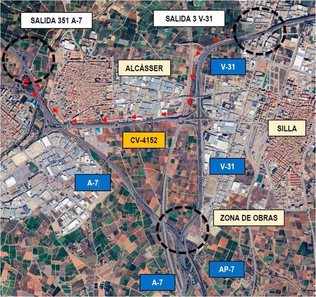 El corte afectará al tramo de la calzada izquierda de la autovía V-31 que conecta con el sentido Alicante de la autovía A-7 (tramo comprendido entre el km 1 y el 0 de la primera). Para garantizar la continuidad del itinerario, en la salida 3 de la V-31 se desviará a los vehículos a la vía de servicio que conecta con la carretera CV-4152 (corredor de Alcàsser) de modo que, a través de esta y de la CV-4153 se acceda al sentido Alicante de la A-7 en el enlace de la salida 351 de esta autovía.