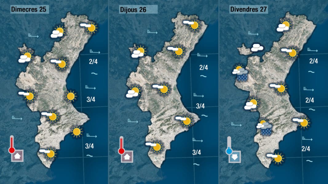 Hará subir de nuevo las temperaturas que se mantendrán altas toda la semana. Podrá escaparse alguna gota pero se tratará de lluvias débiles, de muy poca importancia más probables por la tarde y en el interior de la mitad sur de la Comunitat.