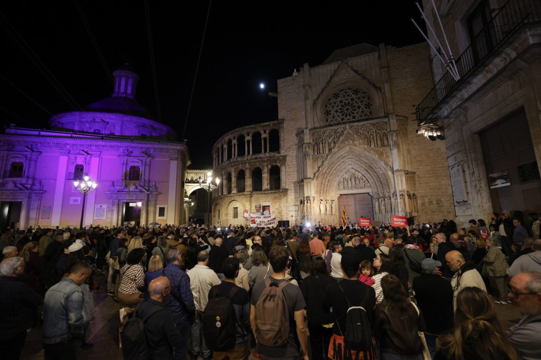 Una concentración en la Plaza de la Virgen de València este lunes, día en que Carlos Mazón ha renunciado como president de la Generalitat, ha reunido a varios cientos de personas para reconocer la lucha de los movimientos sociales que han estado al lado de las víctimas de la DANA y sus familiares durante un año «largo y oscuro».