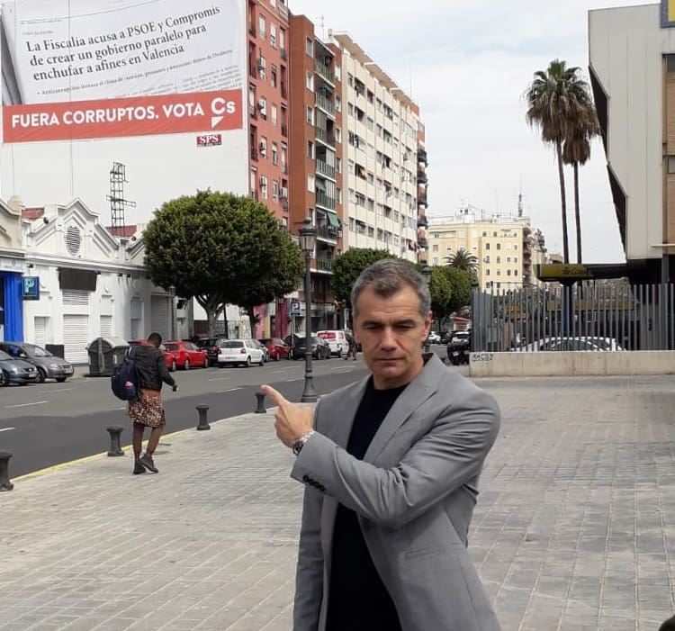 El candidat de la Generalitat Valenciana per Ciudadanos, Toni Cantó, ha penjat a València una lona gegant per a denunciar que en el “tripartit que va vindre a salvar persones també hi ha antiendoll”.