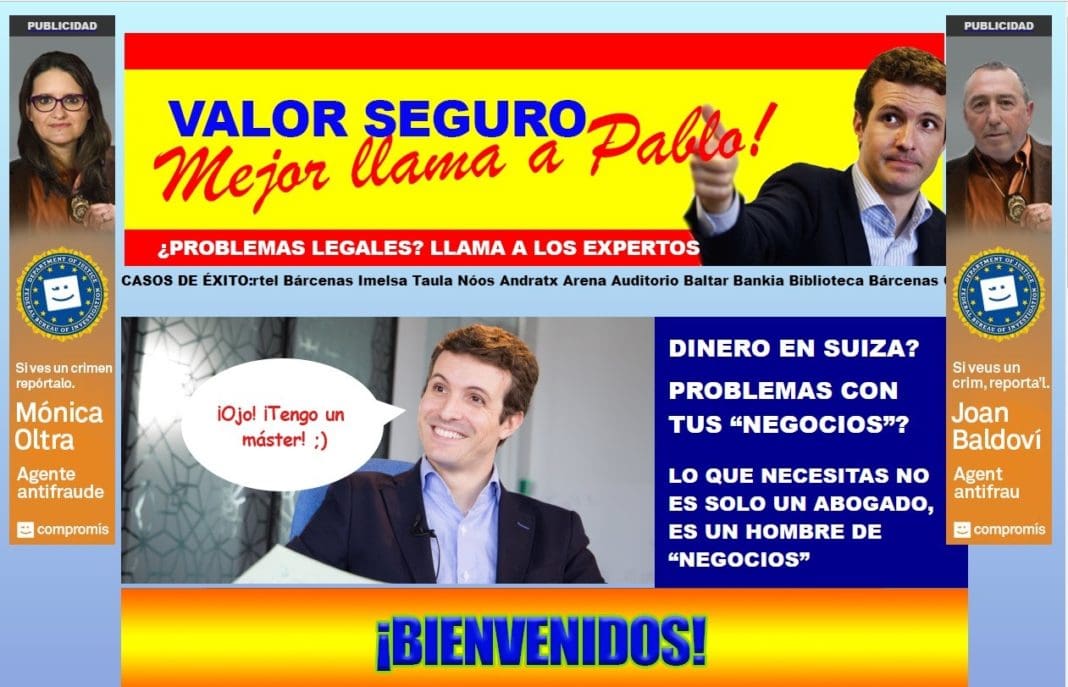 Compromís ha fet pública este dijous la web valorseguro.org on la coalició troleja el lema «Valor Seguro» utilitzat per Pablo Casado durant la campanya electoral per a denunciar en un to humorístic la corrupció del PP. Inspirada en el disseny de la web de la famosa serie «Better call Saul», Compromís presenta al candidat popular com a expert en assessorar en certs «negocis» i aprofita per a recordar el seu polèmic màster.