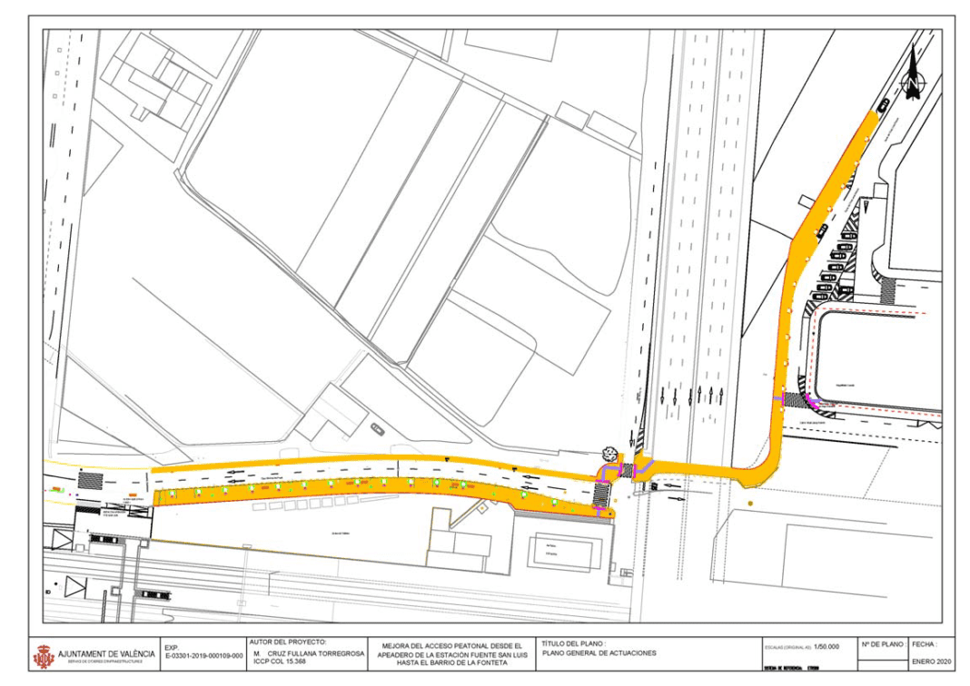 El proyecto tiene como objetivo mejorar el acceso peatonal desde el apeadero de la estación Fuente San Luis hasta el barrio de La Fonteta. Para ello, se plantea la construcción de una acera que prolonga la existente en la margen sur del Camí Molí de les Fonts, que unirá el apeadero con el área urbanizada del barrio, en concreto con la plaza del Músic Cuesta, a unos 200 metros al este de la estación, enlazando con la acera de la calle Vicari José Ramón.