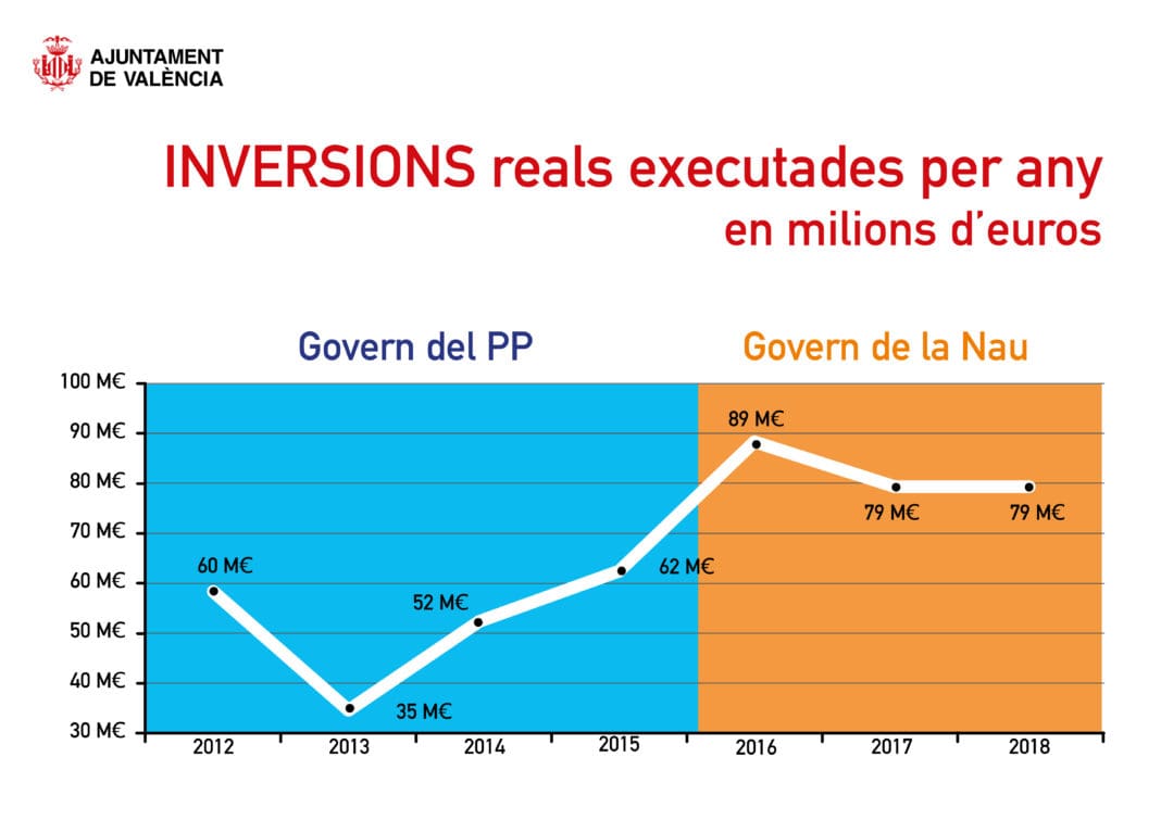 Pel que fa a l’execució de les inversions, 2018 s’ha tancat amb un total de 78,7 milions d’euros d’inversions executades, una xifra pràcticament idèntica a la de l’exercici anterior. Ribó ha destacat «que la mitjana d’inversions en els darrers tres anys, amb gestió completa per part del Govern de la Nau, ha sigut un 68 per cent superior a la mitjana dels últims tres anys complets de gestió municipal amb govern del Partit Popular, en passar d’una mitjana de 49 milions d’euros a una de 82,3 milions d’inversions entre 2016 i 2018». Al mateix temps, el regidor d’Hisenda, Ramón Vilar, ha destacat la xifra d’adjudicació d’inversions durant el 2018, arribant als 104,3 milions d’euros, el que suposarà que durant els primers mesos d’enguany s’executaran inversions per més de 25 milions d’euros provinents del romanent del 2018.