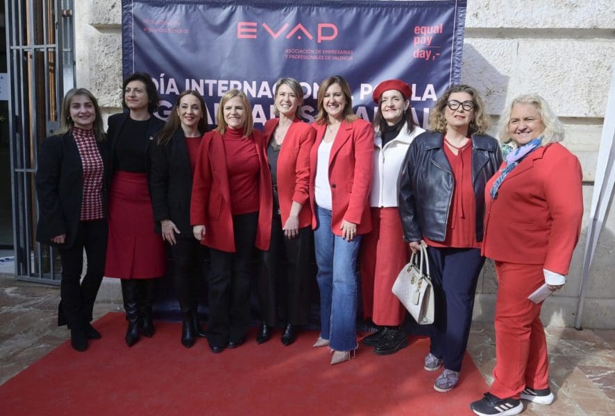 El Ayuntamiento de València se ha sumado esta mañana al Día Internacional por la Igualdad Salarial entre mujeres y hombres, en un acto organizado por la Asociación de Empresarias y Profesionales de València (EVAP) en la plaza de L’Ajuntament, para alertar de la brecha salarial por razón de sexo.