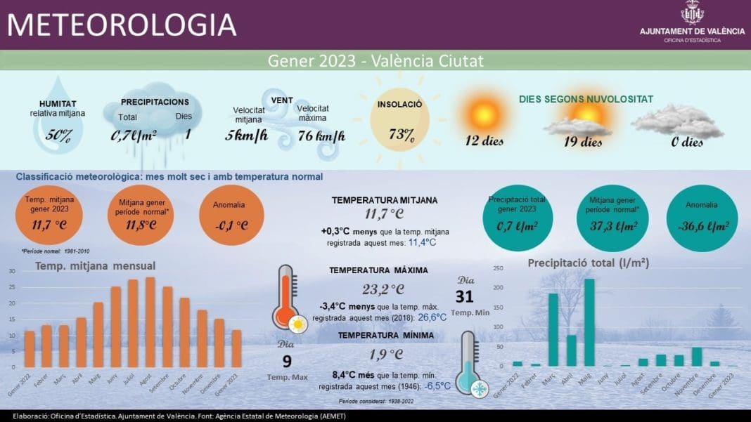 Tal como refleja el cuadro de valores publicado por Estadística Municipal, la temperatura media mensual durante el mes pasado en València ha sido de 11,7 grados centígrados, levemente más alta que la media de enero del año pasado, 2022, que se situó en 11,3 grados.