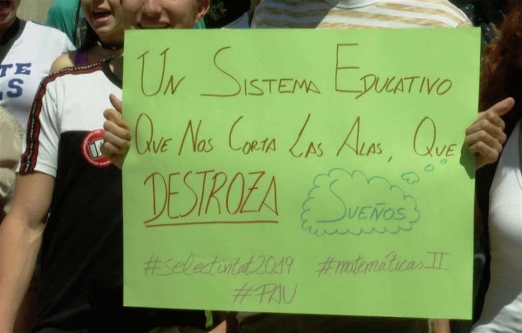 El portaveu del col·lectiu estudiantil, Carlos Naranjo, ha insistit que ha sigut «una vergonya de prova» amb una dificultat «fora de lloc». Per la seua banda, el grup d’alumnes que ha acudit a la concentració ha mostrat un cartell amb el missatge «Un sistema educatiu que ens talla les aules, que destrossa somnis».