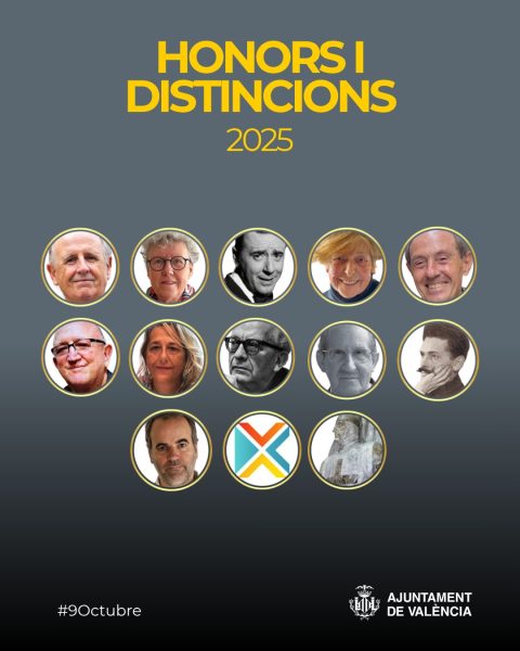 El Pleno local de València ha aprobado este jueves, en la sesión ordinaria del mes de octubre, la concesión de los Honores y Distinciones de la Ciudad de València 2025, en el marco de la conmemoración del 9 d’Octubre, Dia de la Comunitat Valenciana. La alcaldesa de València, María José Catalá, presidirá el acto de entrega de los reconocimientos, que tendrá lugar el próximo lunes, 6 de octubre, en el Hemiciclo Municipal en sesión solemne.