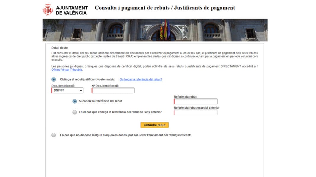 Además, una vez se disponga del recibo, la persona interesada puede proceder al pago en línea mediante tarjeta de crédito o débito, o bien puede imprimir el documento para realizar el pago de forma presencial en una de las entidades bancarias colaboradoras del Ayuntamiento de València indicadas en el propio documento