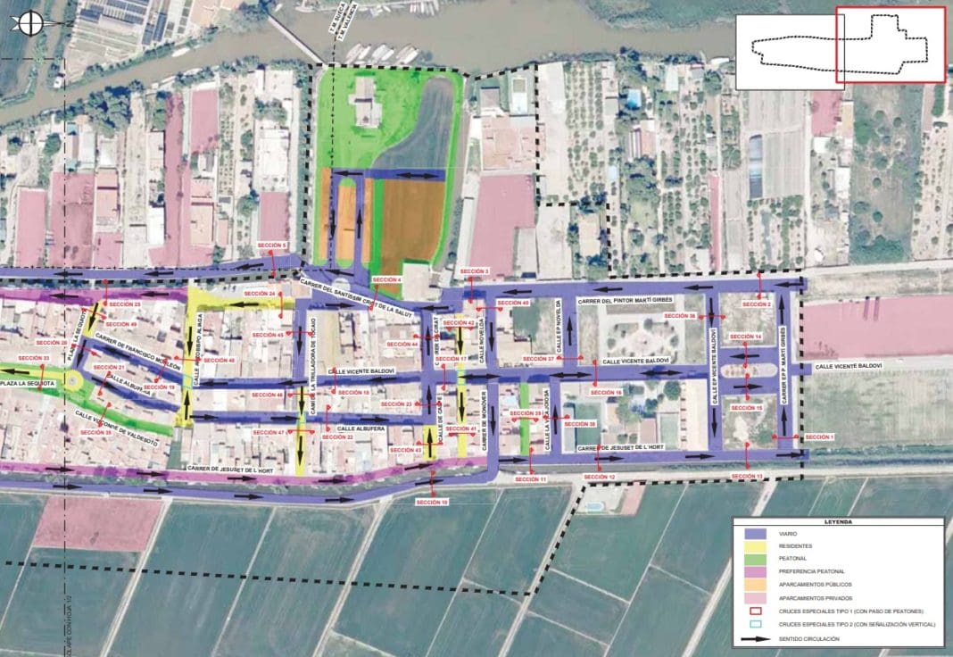 Además, se propone la supresión del nuevo vial previsto de 19 metros de ancho al este de El Palmar por ser contrario al PATH y al PATIVEL. En la plaza de la Iglesia se suprime el doble sentido dejando un único sentido hacia el sur y sin aparcamientos para ganar el máximo espacio entorno al área de protección.