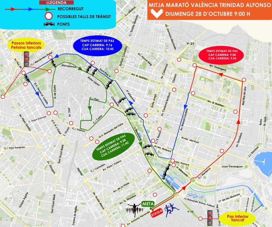 Els carrers afectats pel circut de la cursa són: carrer Antonio Ferrandis, pont de l’Assut de L’Or, carrer Menorca, carrer Serradora, Marí Blas de Lezo, Lluís Peixó, l’avinguda Tarongers, Ramón Llull, l’avinguda Manuel Candela, carrer Pare Tomás Montañana, una secció de l’avinguda de França, el Passeig de l’Albereda, carrer Sant Pius V, Trinitat, Cronista Rivelles, Pla de la Saïdia, carrer Mauro Guillem, avinguda Menéndez Pidal, el pont de les Glòries Valencianes, Gran Via Ferran el Catòlic, Guillem De Castro, Blanqueria, Comte Trénor, Pintor López, General Tovar, carrer de la Pau, Poeta Querol, Roger de Llòria, carrer Xàtiva, Colón, avinguda Navarro Reverter, Jacinto Benavente, Alcalde Reig i Professor López Piñero fins a Antonio Ferrandis de nou.