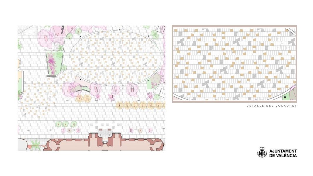 En este espacio, el anteproyecto sustituye la forma poligonal heredada del antiguo aparcamiento. Se incorpora una elipse de 2.211 m², inspirada en el diseño de Goerlich para el mercado de las flores. El acabado incorporará adoquines tipo “volaorets”, un pavimento singular que refuerza la simbología de la catedral de la pólvora y evita el deterioro por las huellas del fuego. A través de estas mejoras, la nueva Plaza del Ayuntamiento València toma forma.