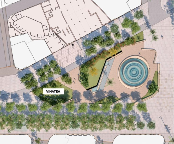 La intervención prevé un jardín perimetral donde se integra la fuente existente y un nuevo espacio con agua definido por un manantial. En esta zona se mantiene la estatua de Francesc de Vinatea, tal como recogen los planos técnicos.