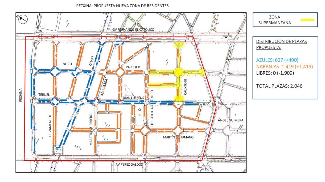 Las 1.419 plazas en zona naranja estarán situadas en las calles Doctor Zamenhof, Sant Jacint, Azcárraga, Palleter, Sant Ignasi de Loiola, Jesús i Maria, Literat Gabriel Miró, Pare Rico, Calixt III, González Martí, Mestre Guerrero, plaza Horticultor Corset, Santa Maria Micaela, Martí l’Humà, Pintor Vila Prades, Villanueva i Gascons y Gran Vía Ferran el Catòlic (números 83 y 71).