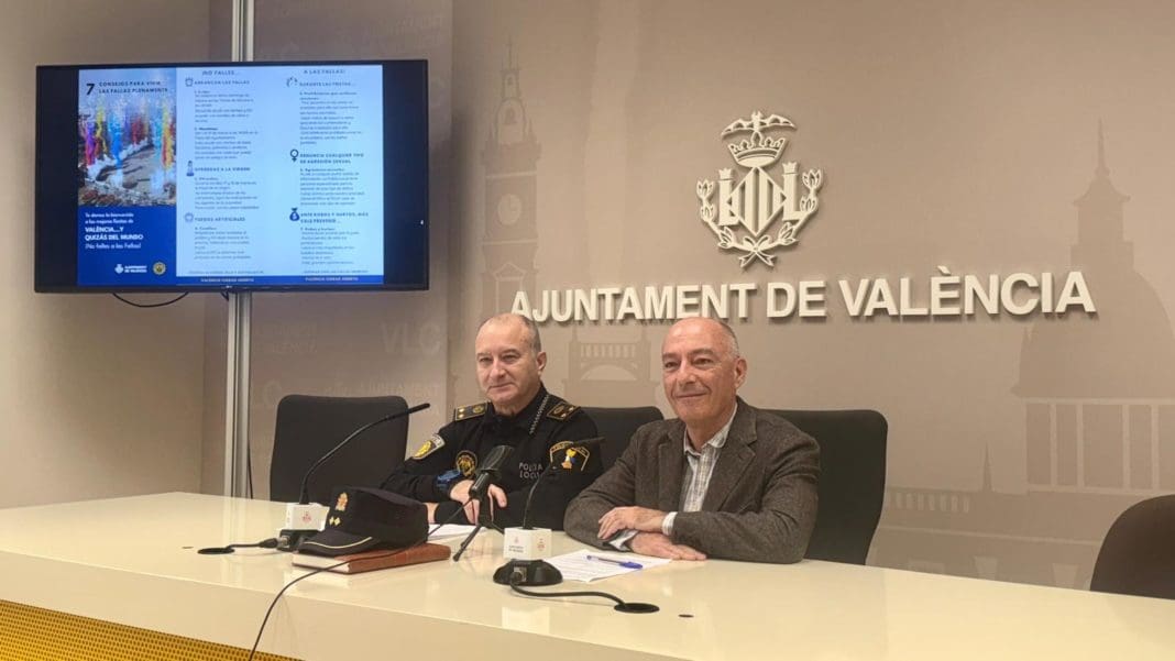El concejal de Seguridad Ciudadana, Jesús Carbonell, y el comisario principal de la División Territorial Operativa, Fernando Giménez Oñate, han presentado este jueves una campaña informativa para vivir las Fallas 2025 de manera “plena y segura” consistente en un tríptico, elaborado por la Policía Local de València, con consejos y recomendaciones.