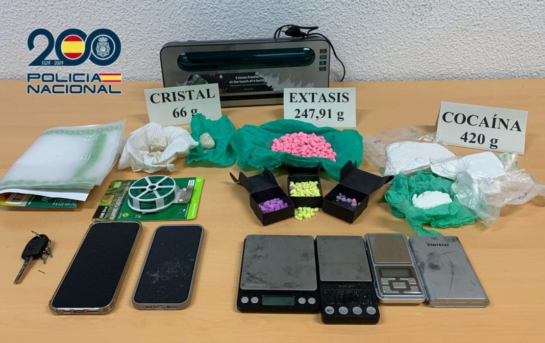 Tras el registro de la vivienda, los investigadores incautaron un total de 420 gramos de cocaína, 66 gramos de metanfetamina cristalina, 248 gramos de éxtasis en pastillas, cuatro básculas de precisión, 1.850 euros, una máquina de embasar al vacío, dos teléfonos móviles, una cámara de vigilancia y varios rollos de fleje.