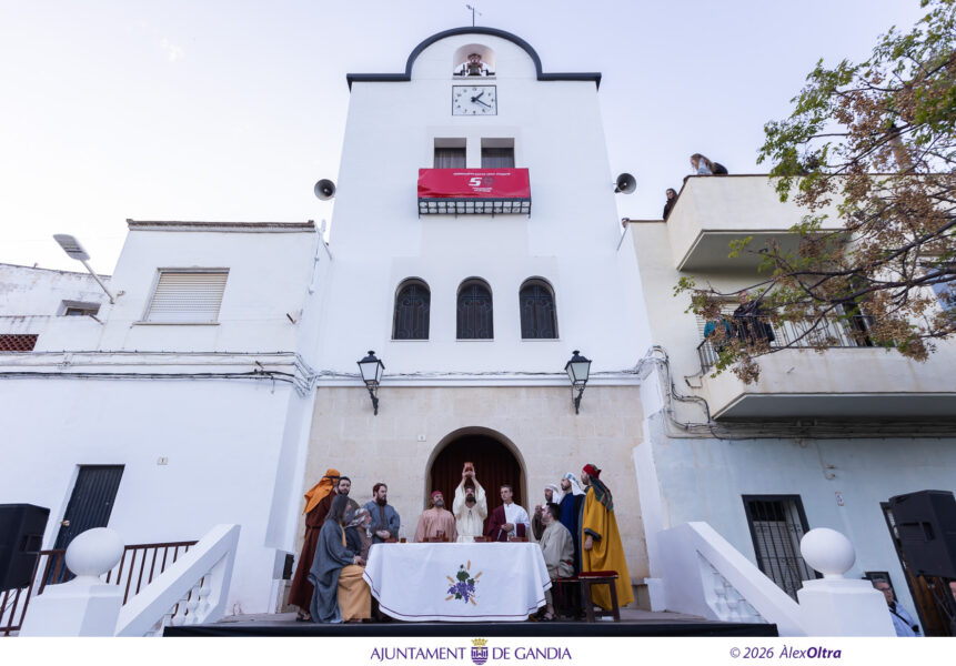 La representación, organizada por la Cofradía de la Santa Cena Viviente, ha congregado a cientos de personas en este enclave de la ciudad, donde cada año se recrea uno de los actos más emblemáticos de la Semana Santa gandiense.