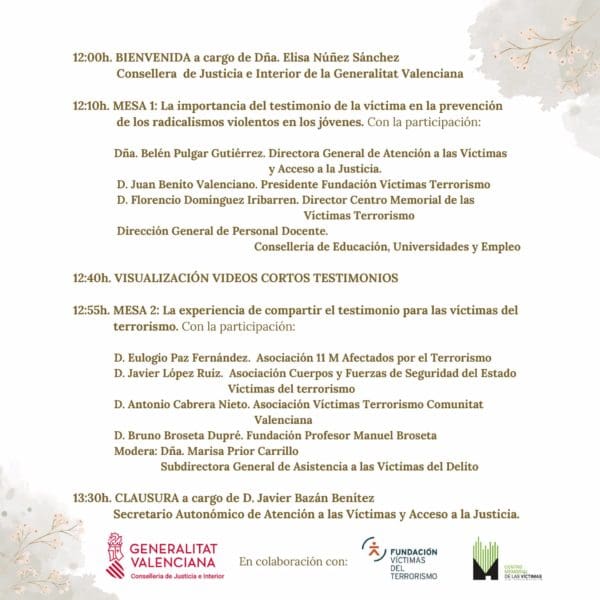 Asimismo, participarán representantes de asociaciones de víctimas, como el presidente de la Fundación Víctimas del Terrorismo, Juan Benito; el director del Centro Memorial de las Víctimas del Terrorismo, Florencio Domínguez; el presidente de la Asociación 11-M Afectados por el Terrorismo, Eulogio Paz; el presidente de la Asociación Cuerpos y Fuerzas de Seguridad del Estado Víctimas del terrorismo, Javier López; el presidente de la Asociación Víctimas Terrorismo de la Comunitat Valenciana, Antonio Cabrera, y presidente de la Fundación Profesor Manuel Broseta, Bruno Broseta.