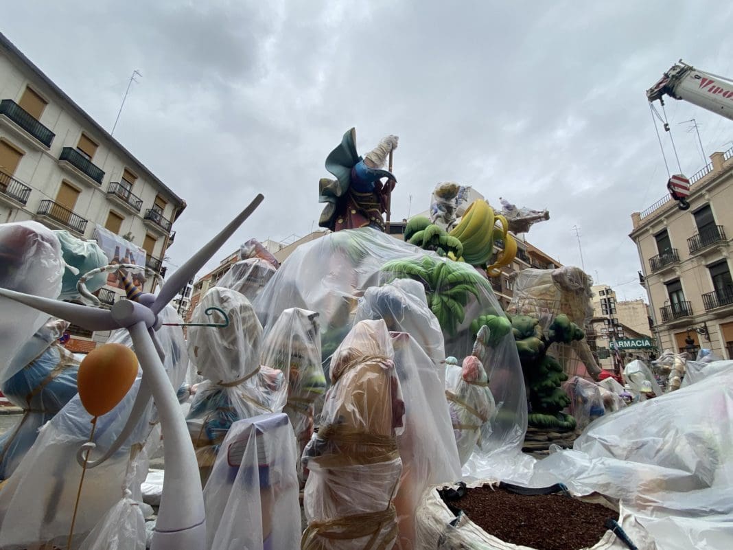 Los artistas falleros prefieren no cubrir los monumentos, ya que en caso de vientos fuertes las lonas pueden hacer 'efecto vela'
