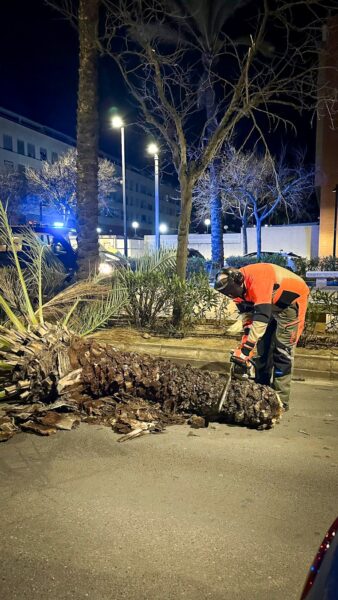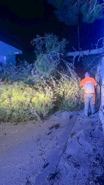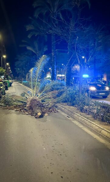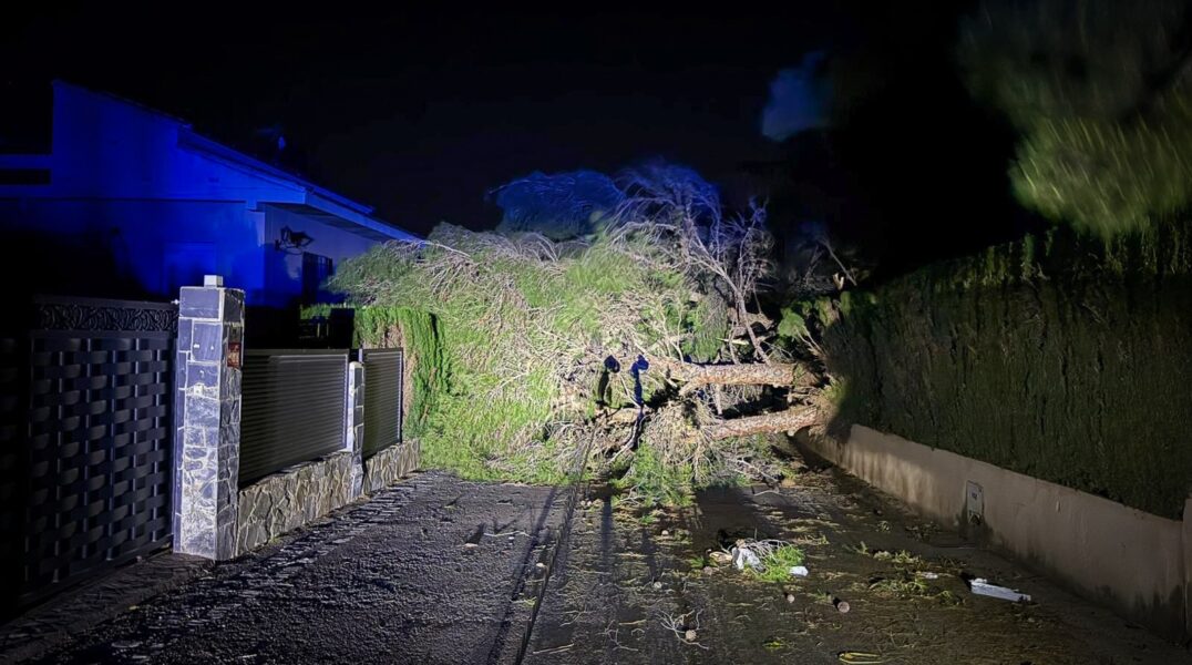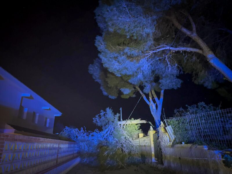 Entre los avisos más relevantes figura la caída de un árbol de unos 30 metros en Corral del Colero, con afectación al tendido eléctrico y a la calzada. También se ha actuado por otro árbol caído sobre líneas eléctricas en la zona de Font de la Teula. Además, ha caído un pino de grandes dimensiones dentro de una parcela privada sobre un edificio entre la Avenida San Lorenzo y Escorial. De igual modo, se ha registrado la caída de una palmera en Genaro Palau.